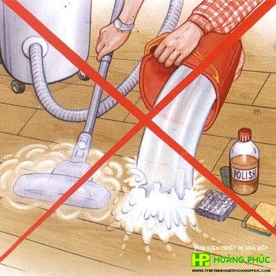Với cấu tạo như vậy sàn gỗ công nghiệp có thể chịu nước rất tốt. Tuy nhiên nếu trong quá trình sử dụng ta không biết giữ gìn và bảo quản tốt thì sẽ dẫn tới làm giảm tuổi thọ của ván sàn công nghiệp. Để nâng cao tuổi thọ của sàn gỗ ta nên hạn chế lau nước nhiều và đặc biệt không được đổ nước ra để lau sàn nhà như hình trên